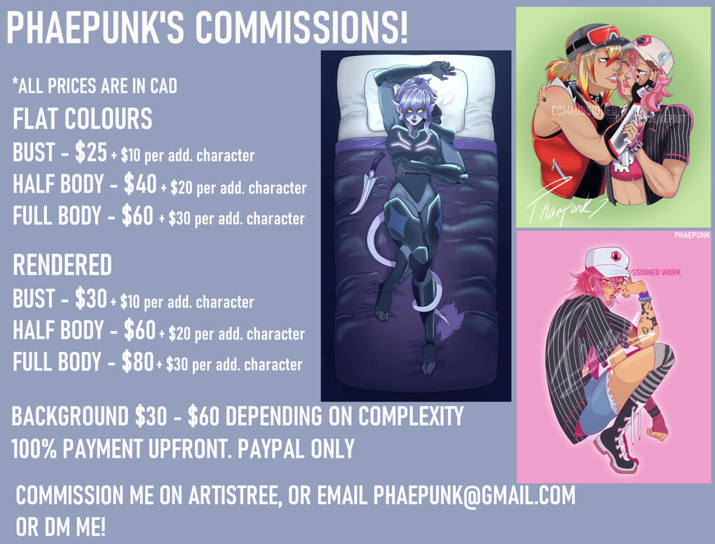 I primarily take commissions from Artistree, which will be linked below. You can also email me at [email protected], or DM on social media, however, commissioning me on Artistree will help me immensely in getting into its marketplace. Paypal only. Payment up front.